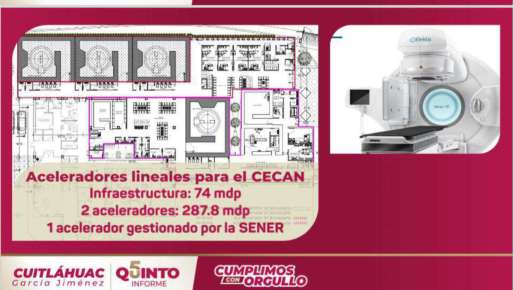 También reiteró la inversión de 287.8 millones de pesos para la instalación de dos aceleradores lineales en el Centro Estatal de Cancerología (CECAN), mientras que uno más fue gestionado por la Secretaría de Energía.