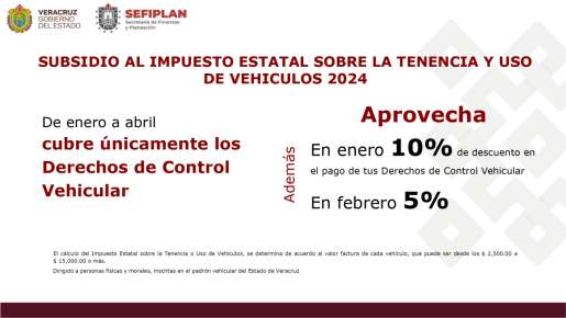 Xalapa, Ver., 04 de enero del 2023.- El Gobierno de Veracruz ofrece, para el pago de derechos vehiculares, un descuento del 10 por ciento en enero y del 5 en febrero; además de la condonación del Impuesto Estatal sobre la Tenencia y Uso de Vehículos 2024, este subsidio estará vigente hasta el mes de abril.