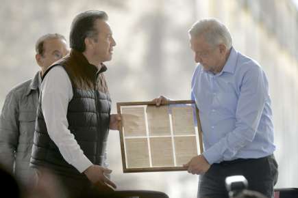 Río Blanco, Ver., 07 de enero de 2024.- Por sus contribuciones a una política laboral de equidad y justicia, el gobernador Cuitláhuac García Jiménez entregó al presidente Andrés Manuel López Obrador una réplica del Decreto del 19 de octubre de 1914 emitido por Cándido Aguilar Vargas en el que promulgó la primera Ley que fijó el salario mínimo para Veracruz.