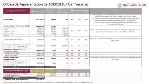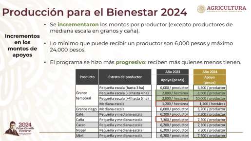 Sobre el segundo de los programas, el representante de la Secretaría de Agricultura y Desarrollo Rural en Veracruz, Oscar Javier Fernández Morales, destacó el aumento de los incentivos por hectárea en granos básicos, recibiendo 6 mil 400 y 10 mil pesos en pequeña escala, y hasta 24 mil los productores medianos; mientras que en café, caña, cacao, nopal y miel será de 7 mil 300 por cultivo.