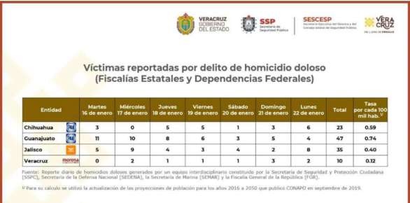 Xalapa, Ver., 23 de enero de 2024.- Del martes 16 al lunes 22 de enero, Veracruz registra casi cinco veces menos homicidios dolosos que la entidad más violenta del país, Guanajuato, pues este territorio suma 47 en el mismo periodo; Jalisco triplica los números con 35, mientras Chihuahua lleva 23 en esta tercera semana del año.