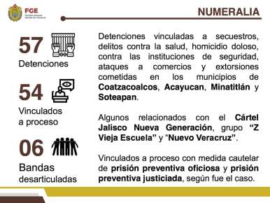 Los operativos han permitido la desarticulación de seis bandas y la vinculación a proceso de 54 personas con medida cautelar de prisión preventiva oficiosa y justificada, según cada caso, algunas de éstas relacionados con el Cártel Jalisco Nueva Generación, grupo Z Vieja Escuela y Nuevo Veracruz.
