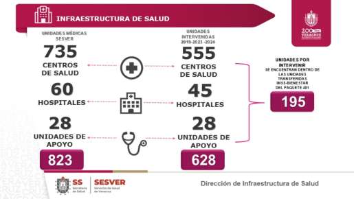 Al mostrar el avance de las acciones iniciadas desde el cierre de 2023, destacó que ya concluyó la rehabilitación del Hospital Regional de Alta Especialidad de Veracruz y están en proceso la del Regional de Poza Rica (oncopediatría), Centro de Alta Especialidad de Xalapa (urgencias y patología); Regional Dr. Luis F. Nachón (urgencias) y el General de Tarimoya en Veracruz (tocología y pediatría).