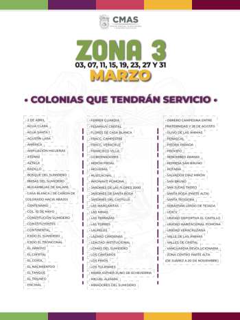 De esta manera la zona uno tendrá el servicio de agua potable los días 1, 5, 9, 13, 17, 21, 25 y 29 de marzo, y comprende las siguientes colonias: 12 de Diciembre, 2 de Julio, 21 de Marzo, 23 de Marzo, 24 de Abril, 6 de Junio, 7 de Noviembre, Acueducto cerro colorado, Ampliación brisas del sumidero, Ampliación Margarita Maza de Juárez, Ampliación Unión, Ampliación Vasconcelos.
