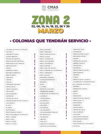 Por cuanto hace a la zona 2, le corresponderá tener el servicio durante los días 2, 6, 10, 14, 18, 22, 26, y 30 de marzo, las siguientes colonias: 2 de Abril (a la altura de La Piedad), 3 de Mayo, Adalberto Tejeda, Álvaro Obregón, Ampliación libertad, Ánimas Sección Cafetales, Arboledas de Las Trancas, Arroyo Blanco, Atenas, Barranca Honda, Belisario Domínguez, Benito Juárez, Cafetales, Cafetos, Calpulli y Campestre Porvenir.
