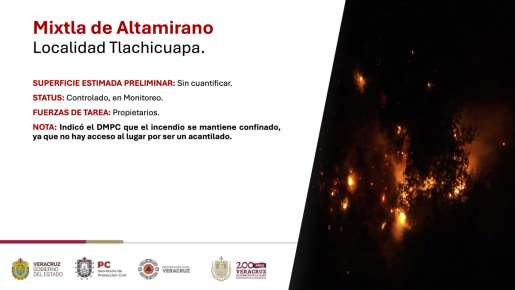 En su reporte, la Secretaría de Protección Civil, detalló también la atención del incendio en la localidad Tlachicualpa de Mixtla de Altamirano, confinado y en vigilancia por los propietarios de los predios. Hasta el momento no se pueden precisar las afectaciones, ya que se encuentra en una cañada.