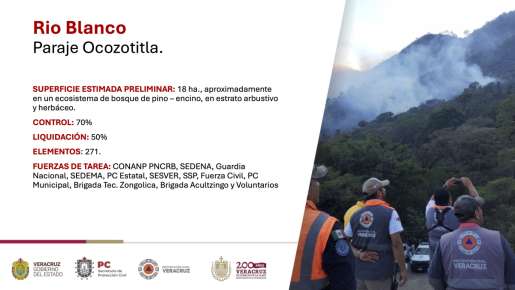 Xalapa, Ver., 16 de abril de 2024.- El incendio registrado en el paraje Ocozotitla en Río Blanco está controlado en un 70 por ciento y no representa riesgo para la población, mientras que la vigilancia y monitoreo está a cargo de 271 elementos, informó el Gobierno del Estado.