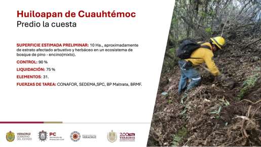 Así como la ubicada en el predio La Cuesta de Huiloapan de Cuauhtémoc, con una superficie afectada de 10 hectáreas, un 90 por ciento de control y 75 de liquidación, así como una fuerza de tarea conformada por 31 elementos.
