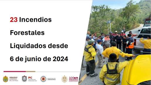 Xalapa, Ver., 10 de junio de 2024.- Al corte de este lunes, el Gobierno de Veracruz informó que desde el pasado 6 de junio han sido liquidados 23 incendios forestales de distintas magnitudes, estando 16 activos que combaten varias fuerzas de tarea institucionales y voluntarias encabezadas por la Secretaría de Protección Civil.