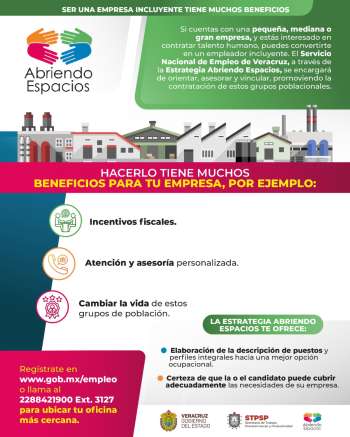 Del mismo modo, la dependencia dio a conocer que actualmente se está reforzando la herramienta Abriendo Espacios con el objetivo de incluir a personas con discapacidad o adultos mayores en las plantillas laborales. Dicho proyecto da asesoría a empresas para cubrir plazas además de algunos incentivos fiscales; lo anterior a través del perfilamiento de habilidades con las pruebas VALPAR.