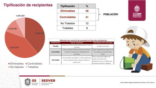 De 20 millones de recipientes encontrados en viviendas, sólo un 8 por ciento es tratable (tanques, tambos, pilas, piletas, pozos, tinacos y llantas); ahí fue aplicado larvicida y el 90 por ciento de los posibles criaderos son anulables o controlables.