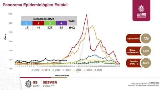 Al corte de la semana 26, Veracruz ocupa el décimo segundo lugar a nivel nacional con mil 936 casos confirmados, de los cuales el 81.7 por ciento corresponden al serotipo DENV-3.