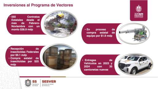 La titular de la dependencia, Guadalupe Díaz del Castillo Flores, destacó que la inversión federal y estatal consta de otros 34.1 millones destinados a la compra de insecticidas, entrega de 35 camionetas nuevas en 2023 y 2024, además de la adquisición de equipamiento por 1.9 millones.