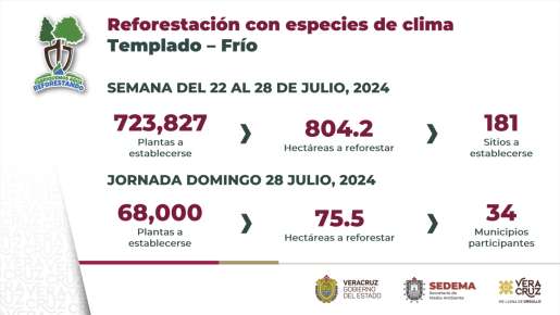 Del 22 al 28 de julio, el Gobierno de Veracruz celebra la Semana de Reforestación Masiva en la que otros 723 mil 827 ejemplares abarcarán 804.2 hectáreas, labor en la que participan municipios, silvicultores y sociedad civil organizada a fin de conservar los ecosistemas y contrarrestar los efectos del cambio climático.