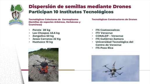 Para agilizar el proceso en sitios de difícil acceso, 18 drones adaptados en los institutos tecnológicos de Coatzacoalcos, Gutiérrez Zamora, Poza Rica, Veracruz, la Universidad Tecnológica del Centro de Veracruz y el CONALEP dispersarán 155.6 kilogramos de semillas pregerminadas.