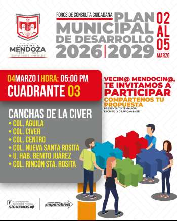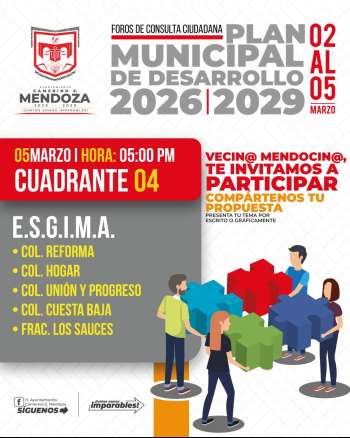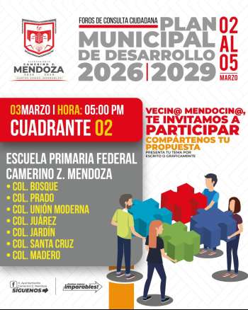 Camerino Z. Mendoza, Veracruz.- El Gobierno Municipal de Camerino Z. Mendoza, que preside Gustavo Sánchez Ortiz, invitó a la población mendocina a participar en los Foros de Consulta Ciudadana para la elaboración del Plan Municipal de Desarrollo 2026-2029, un ejercicio abierto que permitirá integrar ideas y propuestas en beneficio del municipio.