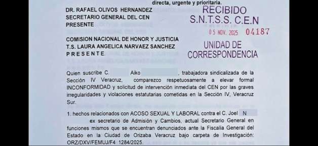 Irineo Pérez Melo.- Agremiada del Sindicato Nacional del Seguro Social (SNTSS) Sección IV, Veracruz Sur, denunció ser víctima de acoso laboral y sexual por parte del secretario general de esta organización sindical Joel N, y pese a que denunció ante las autoridades de la institución y sindicales, nunca recibió respuesta satisfactoria a sus demandas.
