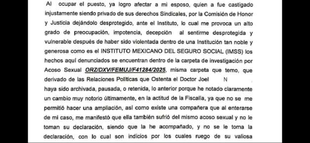 Acusó también que pidió la intervención de la dirigencia nacional del SNTSS, que encabeza Rafael Olivos Hernández, por los hechos graves denunciados formalmente, sin embargo, no hubo respuesta ni acciones visibles para proteger a las presuntas víctimas ni para salvaguardar los derechos de una mujer que acudió a las instancias internas en busca de respaldo.